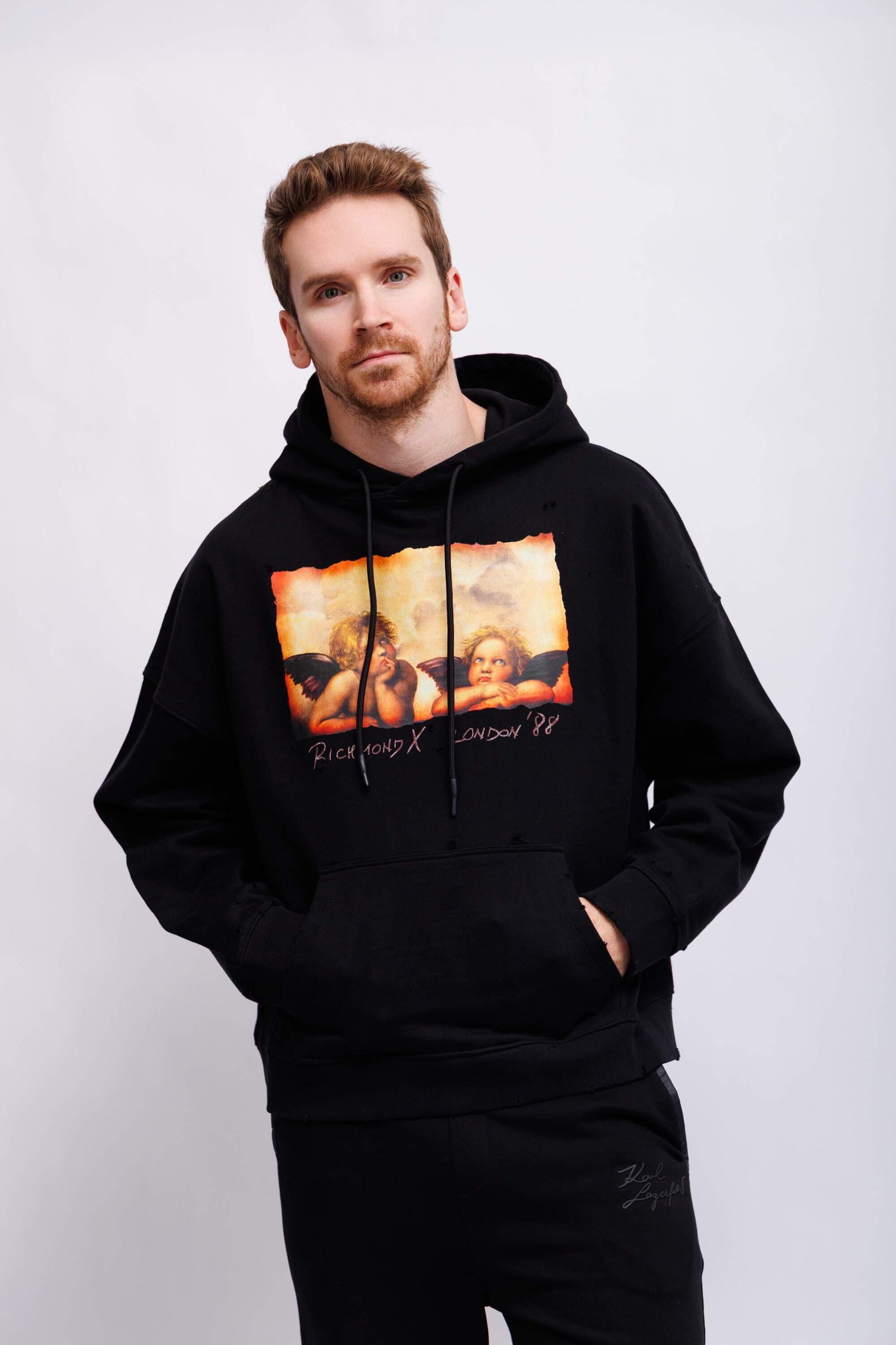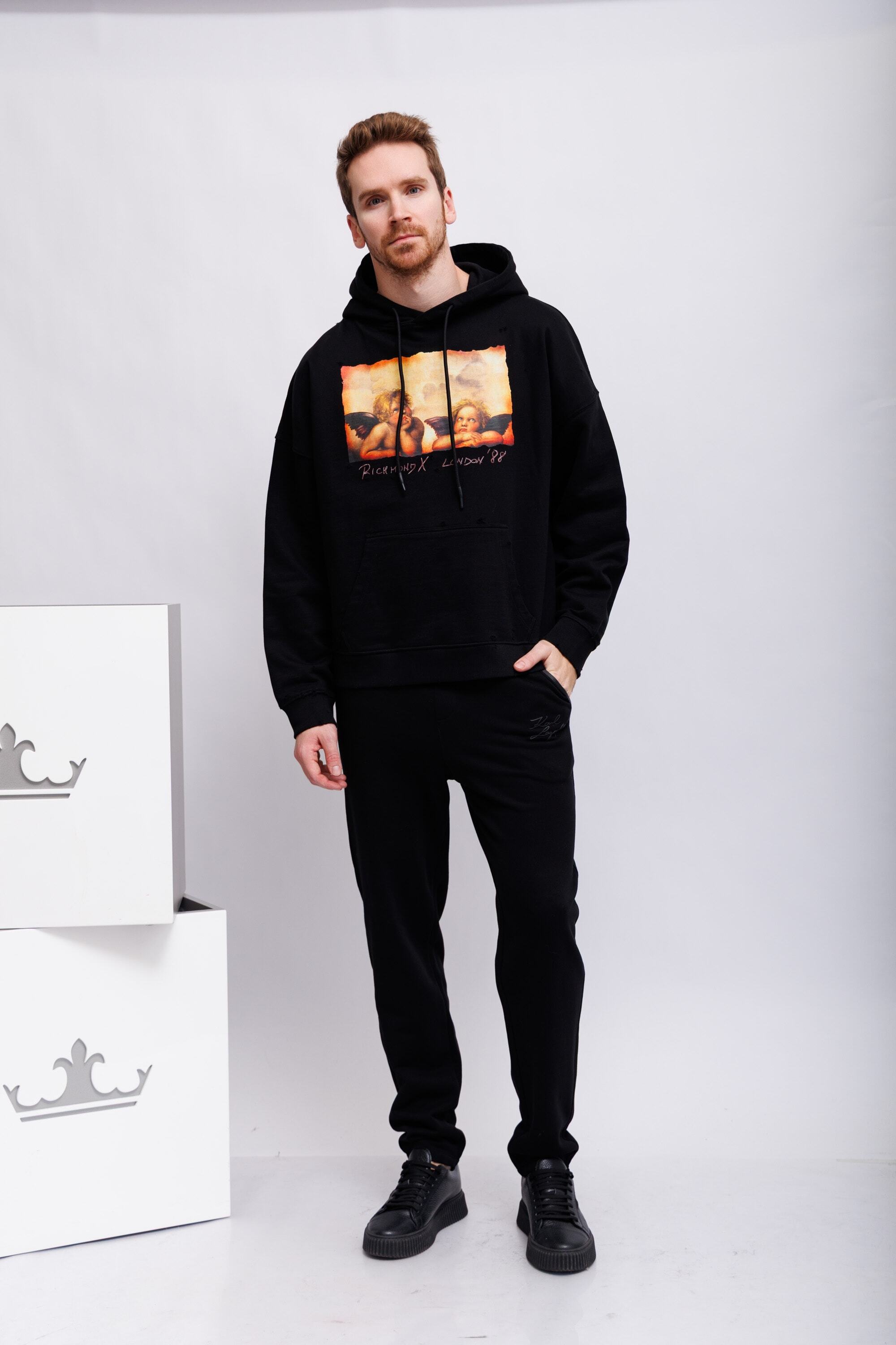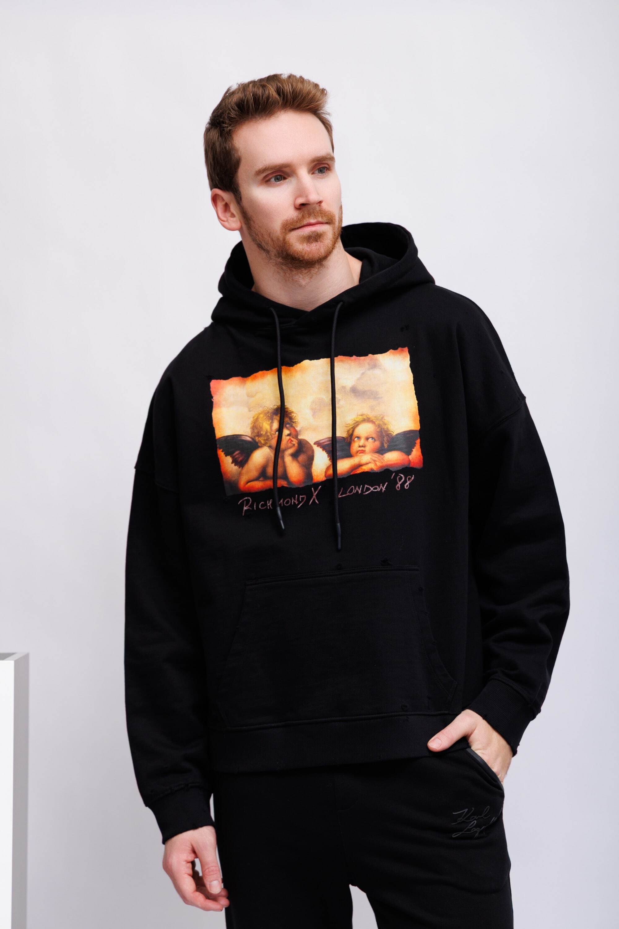 Худи чёрныйКапюшон на кулискеНа груди- ангелочки(фрагмент картины Рафаэля "Сикстинская Мадонна")Спущенная линия плечДлинные рукава на эластичных манжетахКарман-кенгуруНиз изделия-трикотажная резинка