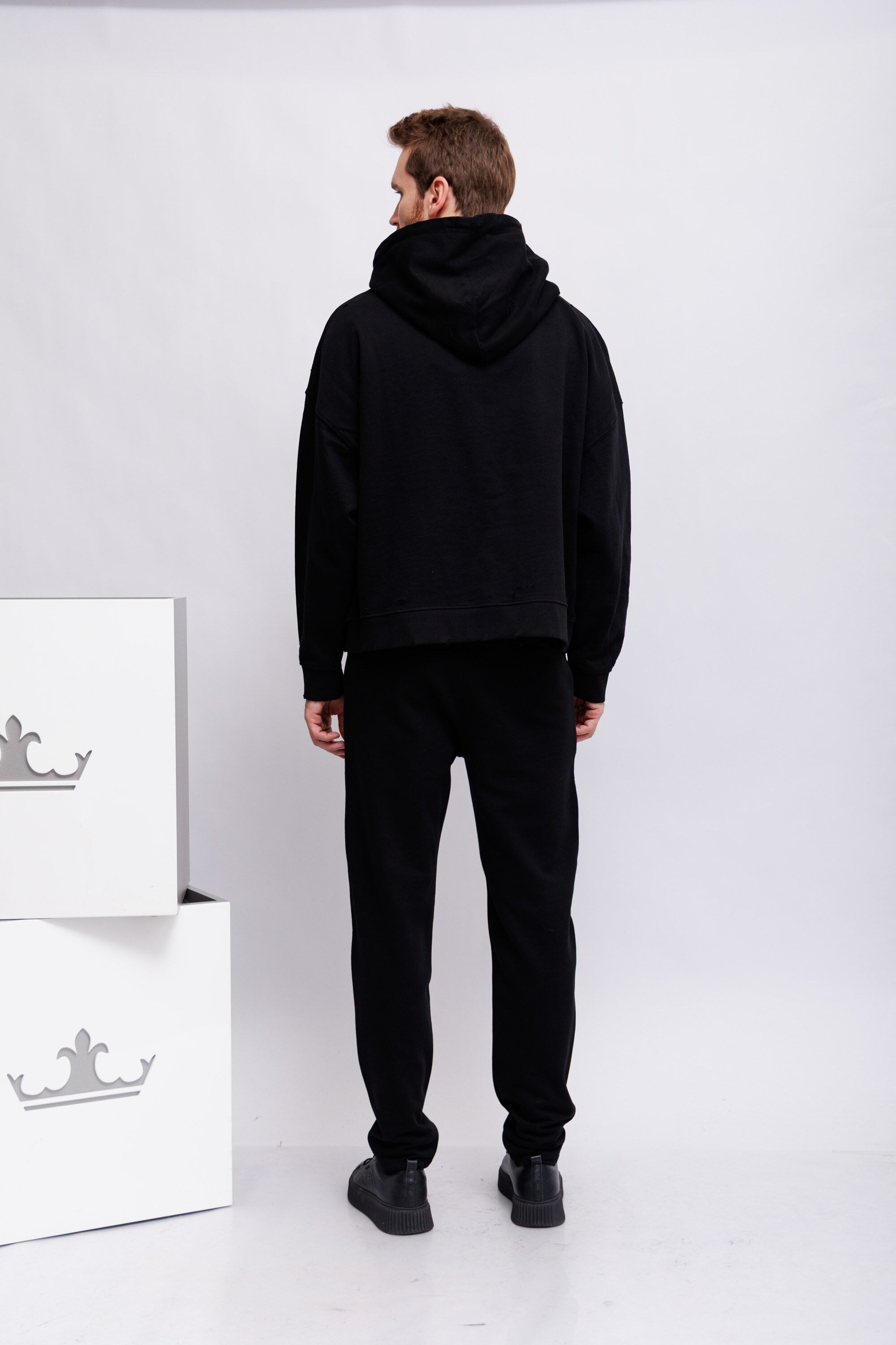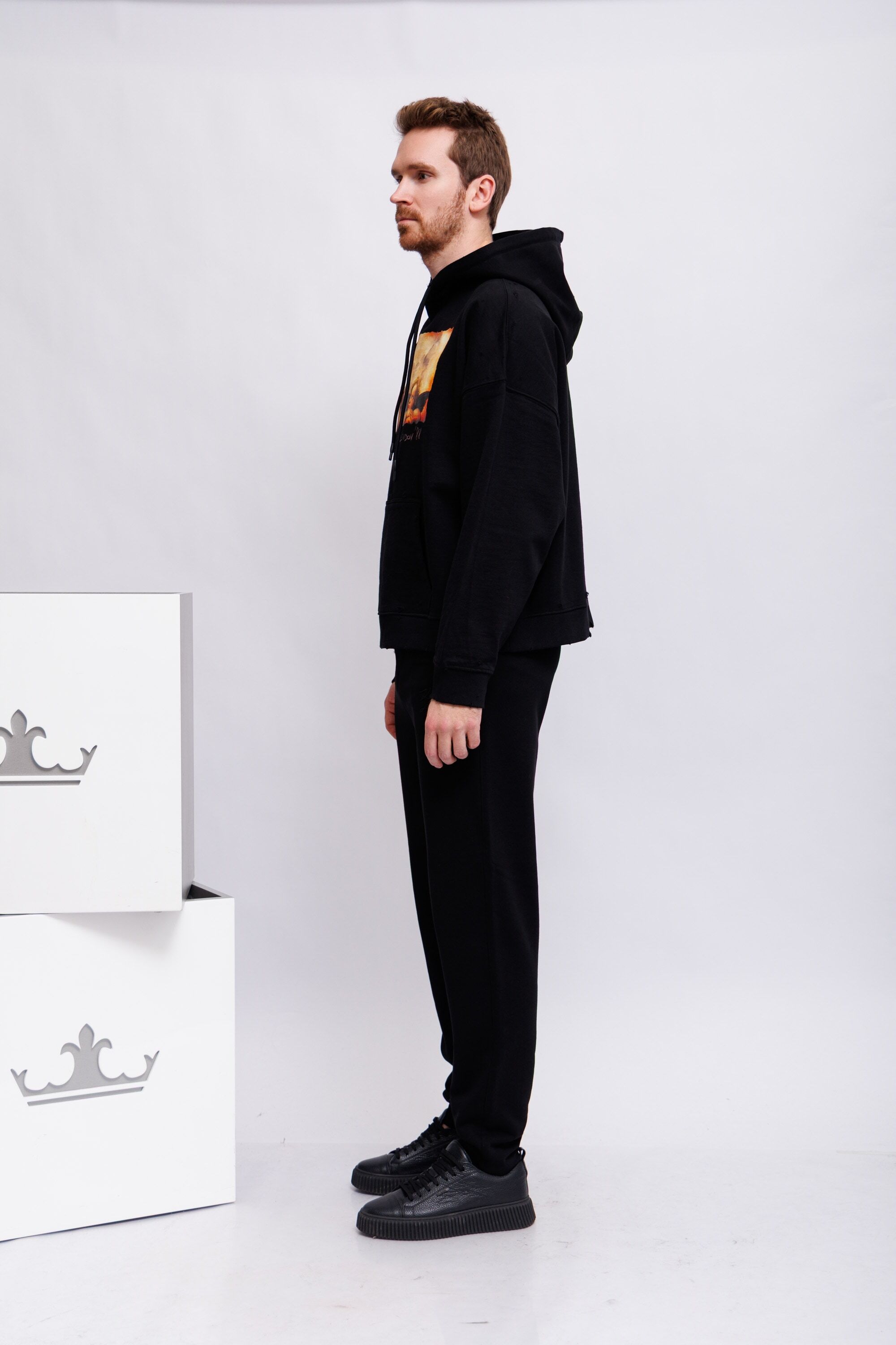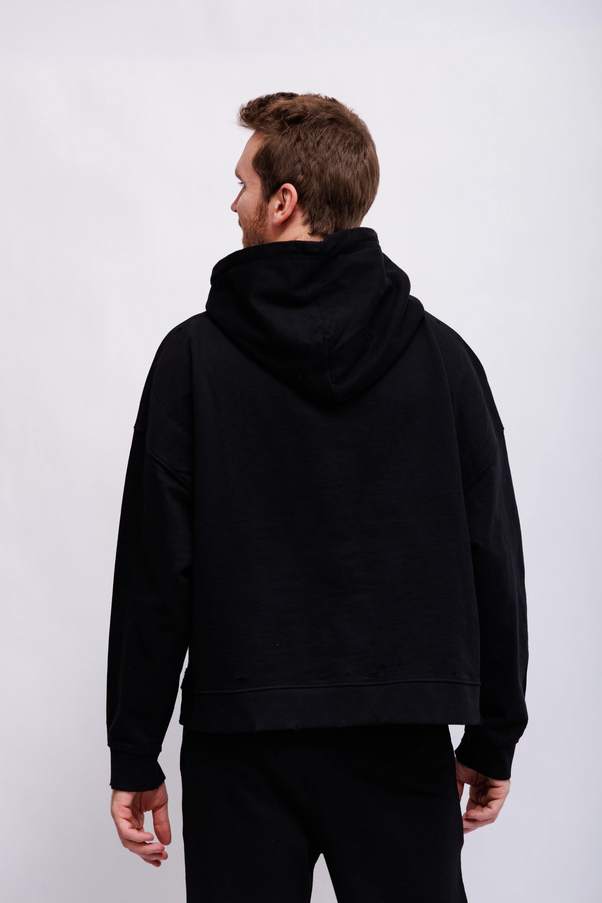 Худи чёрныйКапюшон на кулискеНа груди- ангелочки(фрагмент картины Рафаэля "Сикстинская Мадонна")Спущенная линия плечДлинные рукава на эластичных манжетахКарман-кенгуруНиз изделия-трикотажная резинка