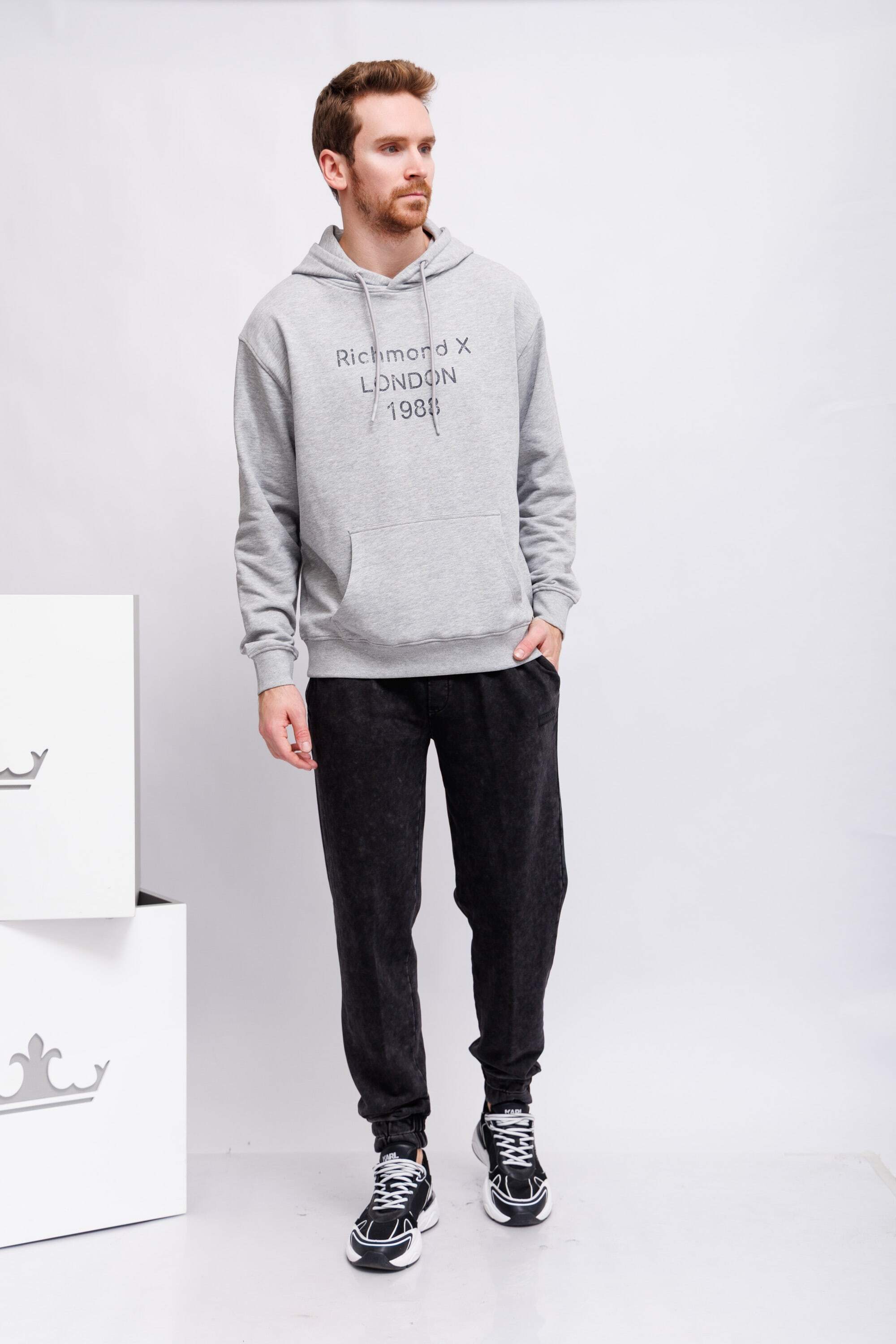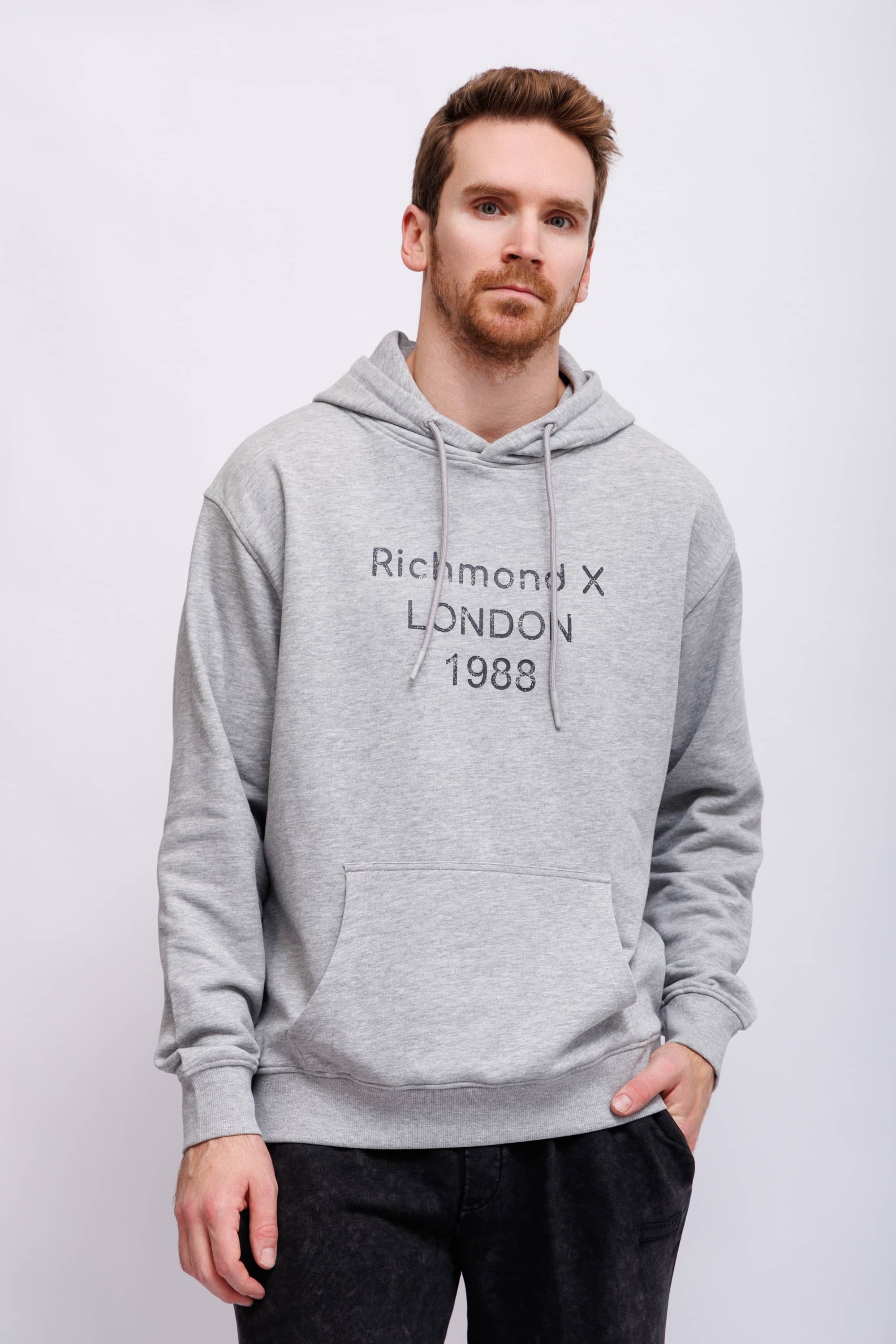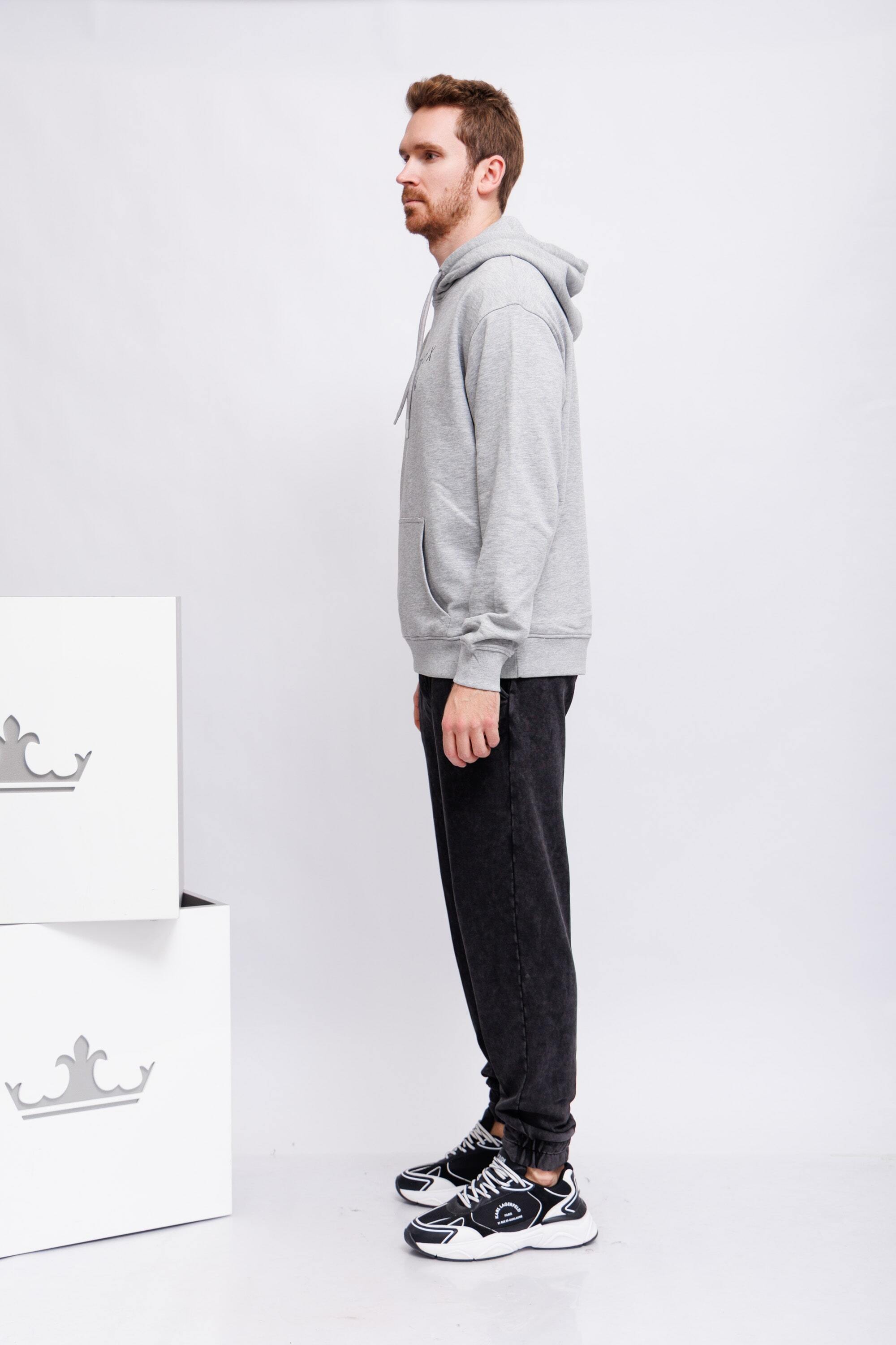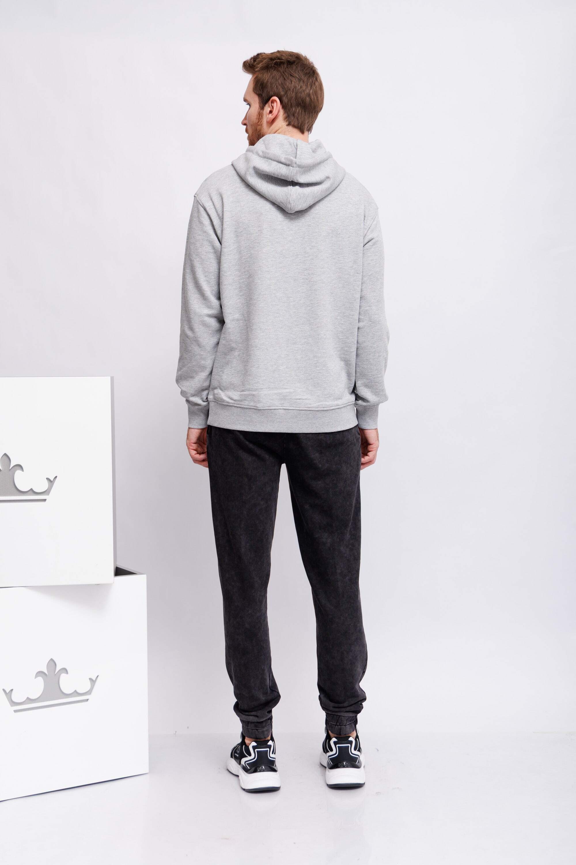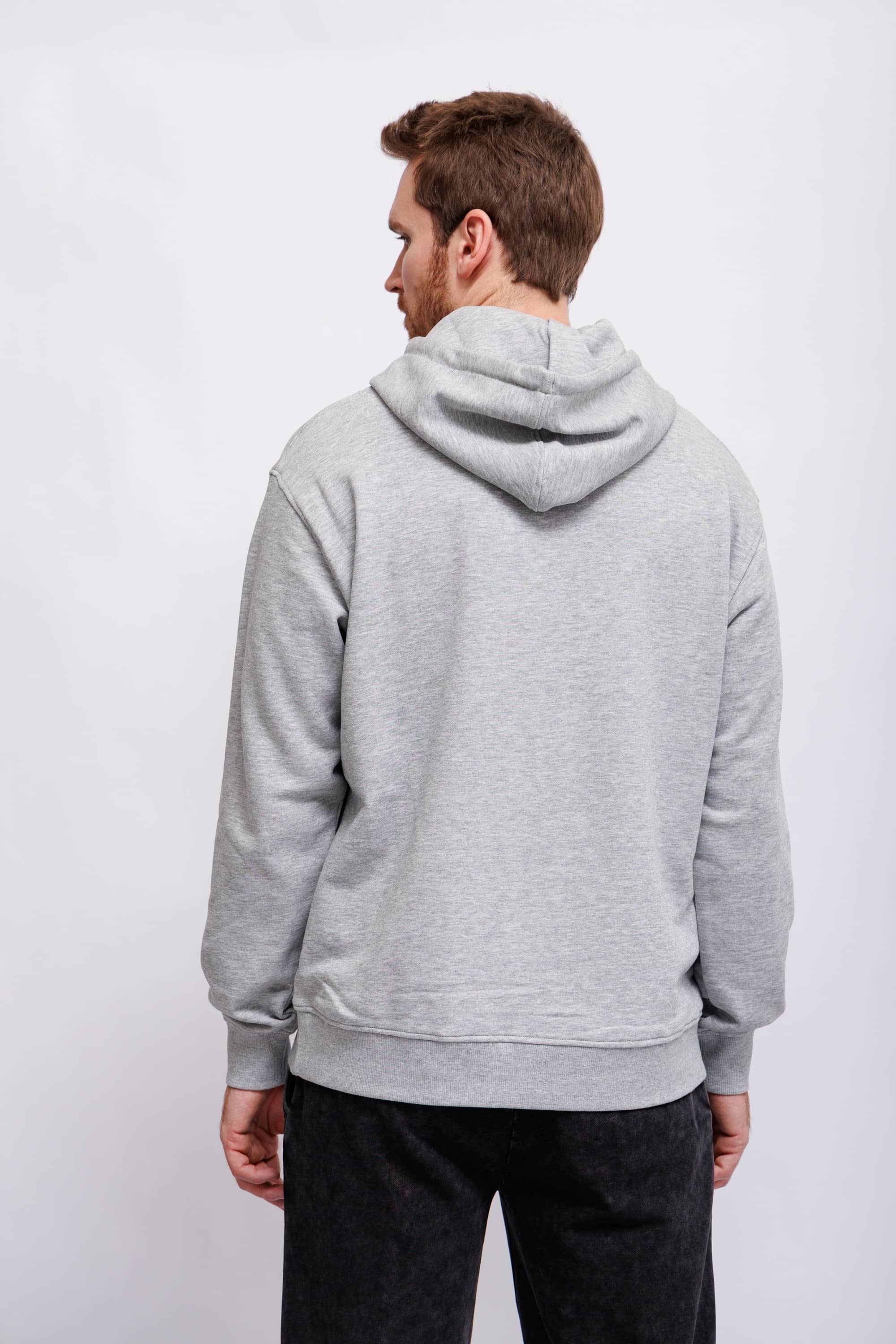 Худи серый с эффектом меланжаКапюшон на кулискеНа груди- логотипСпущенная линия плечДлинные рукава на эластичных манжетахКарман-кенгуруНиз изделия-трикотажная резинка