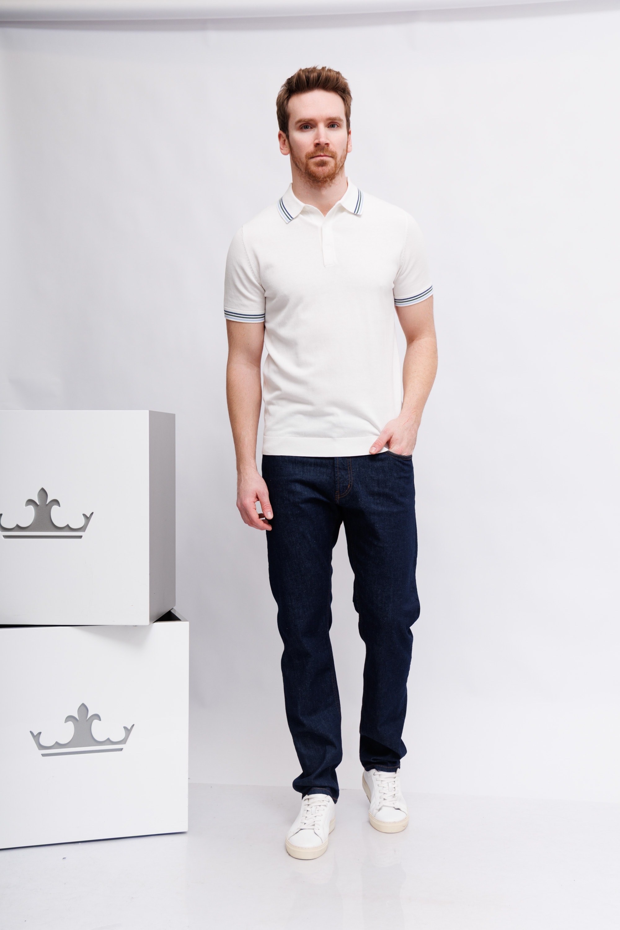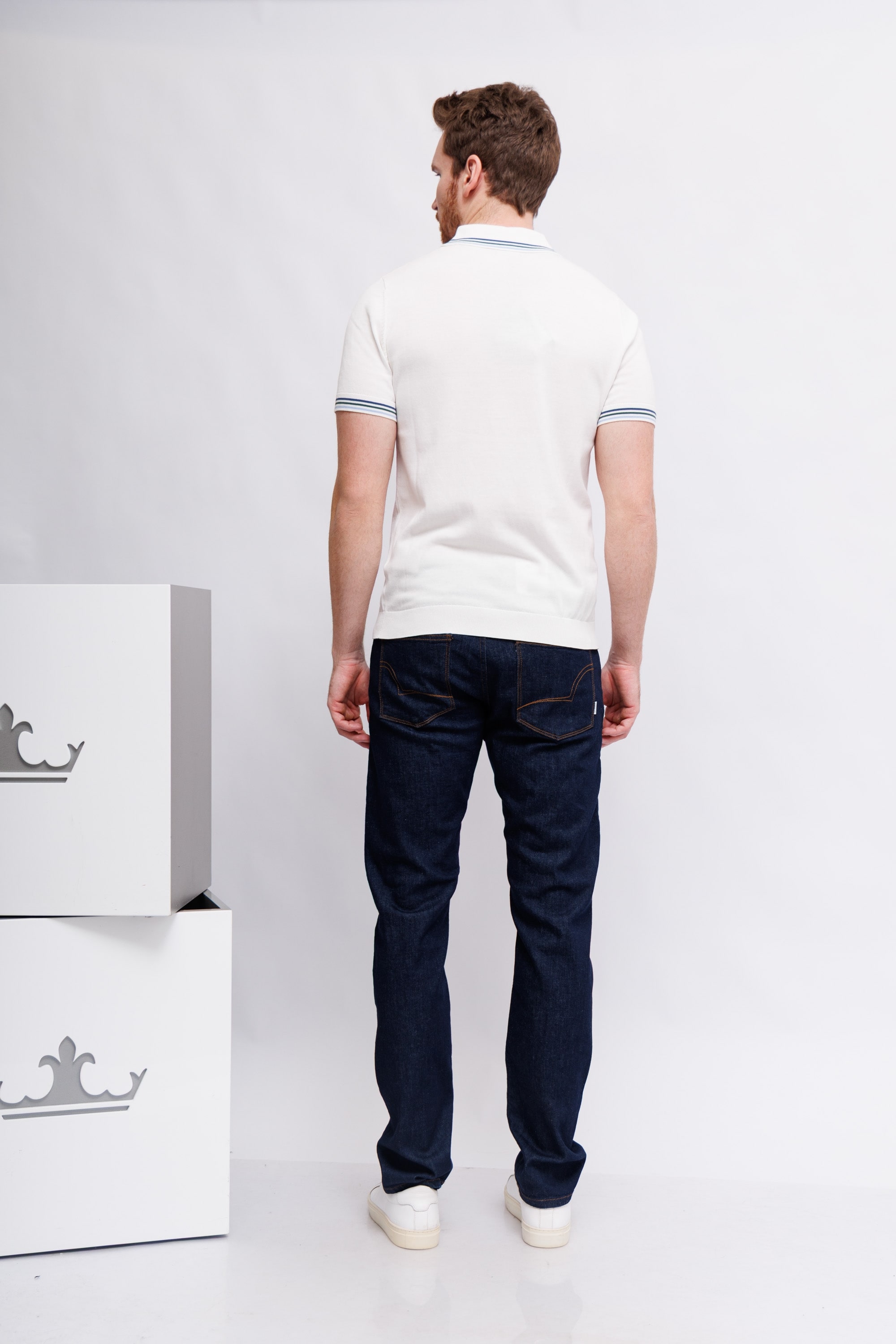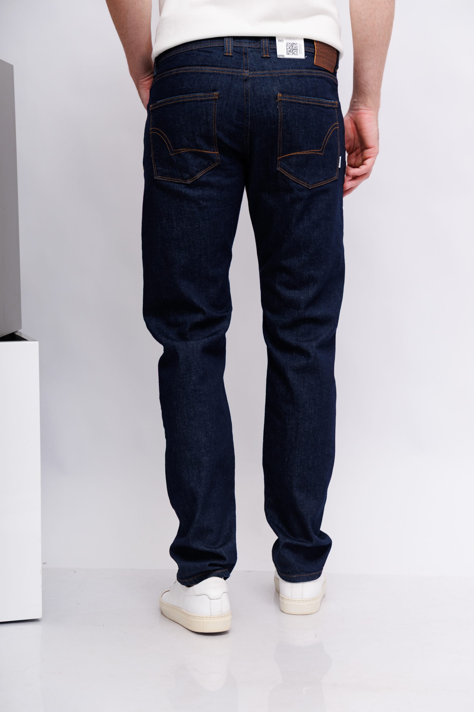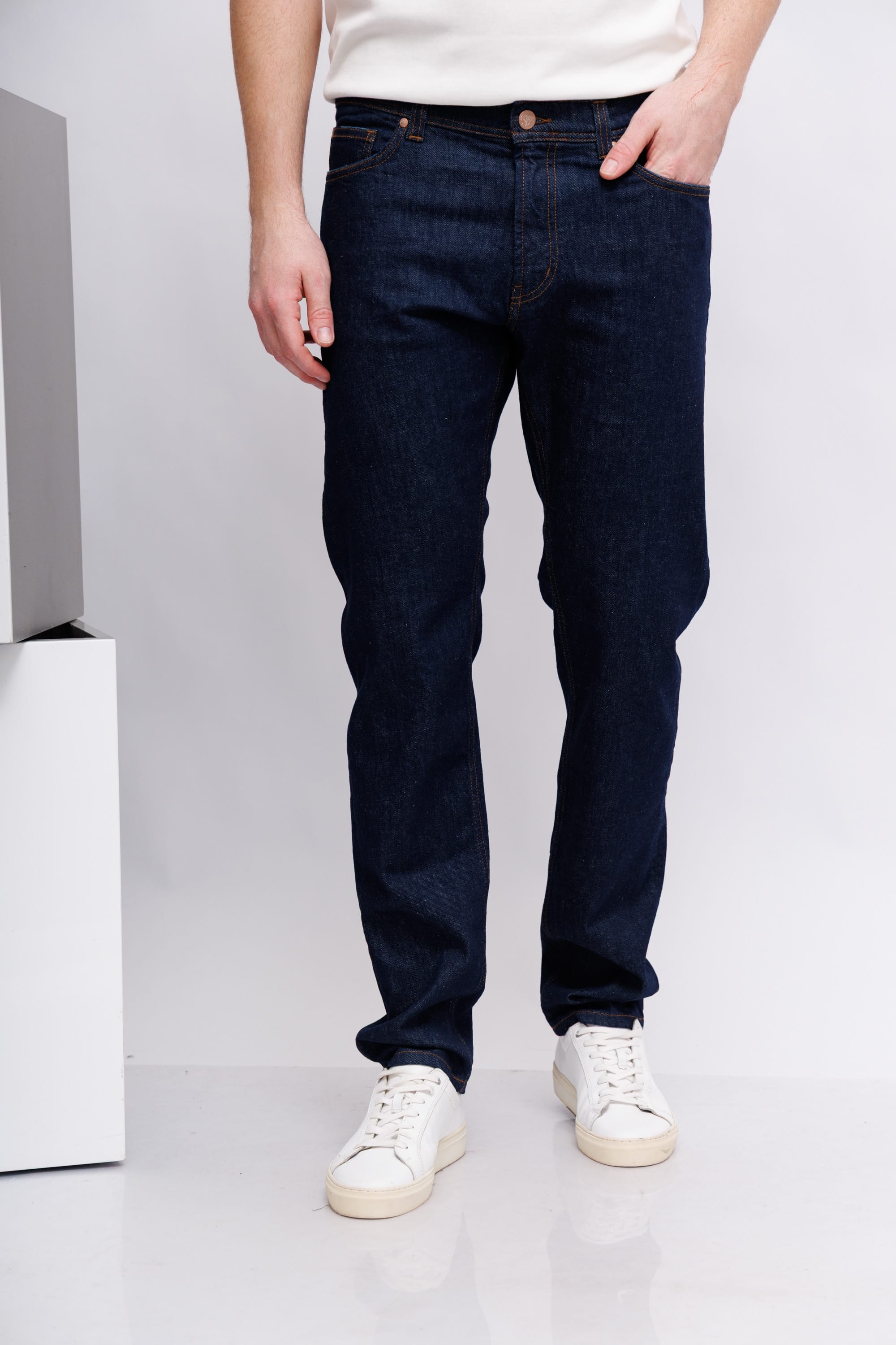 Джинсы темно-синие классическиеМодель "5 карманов"Гульфик на молнии и металлической пуговицеЗауженный кройОтстрочка контрастная