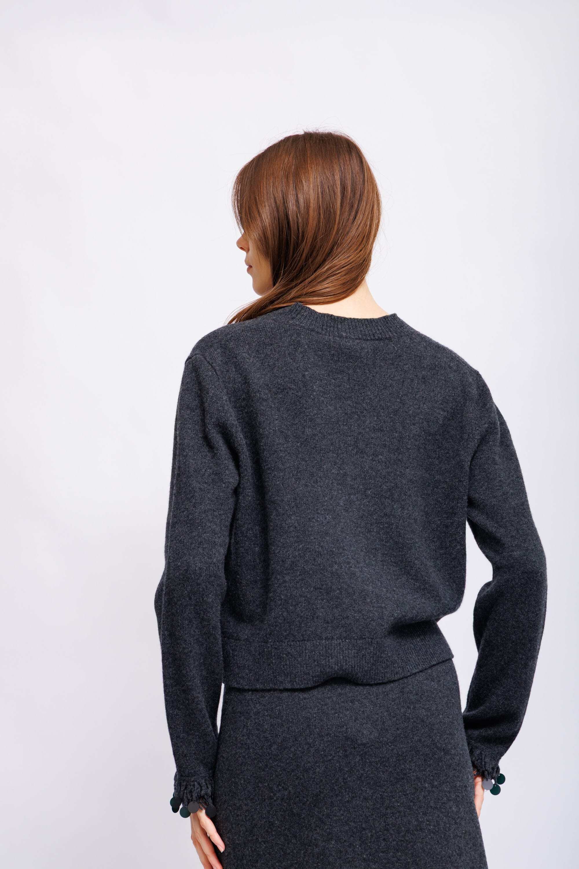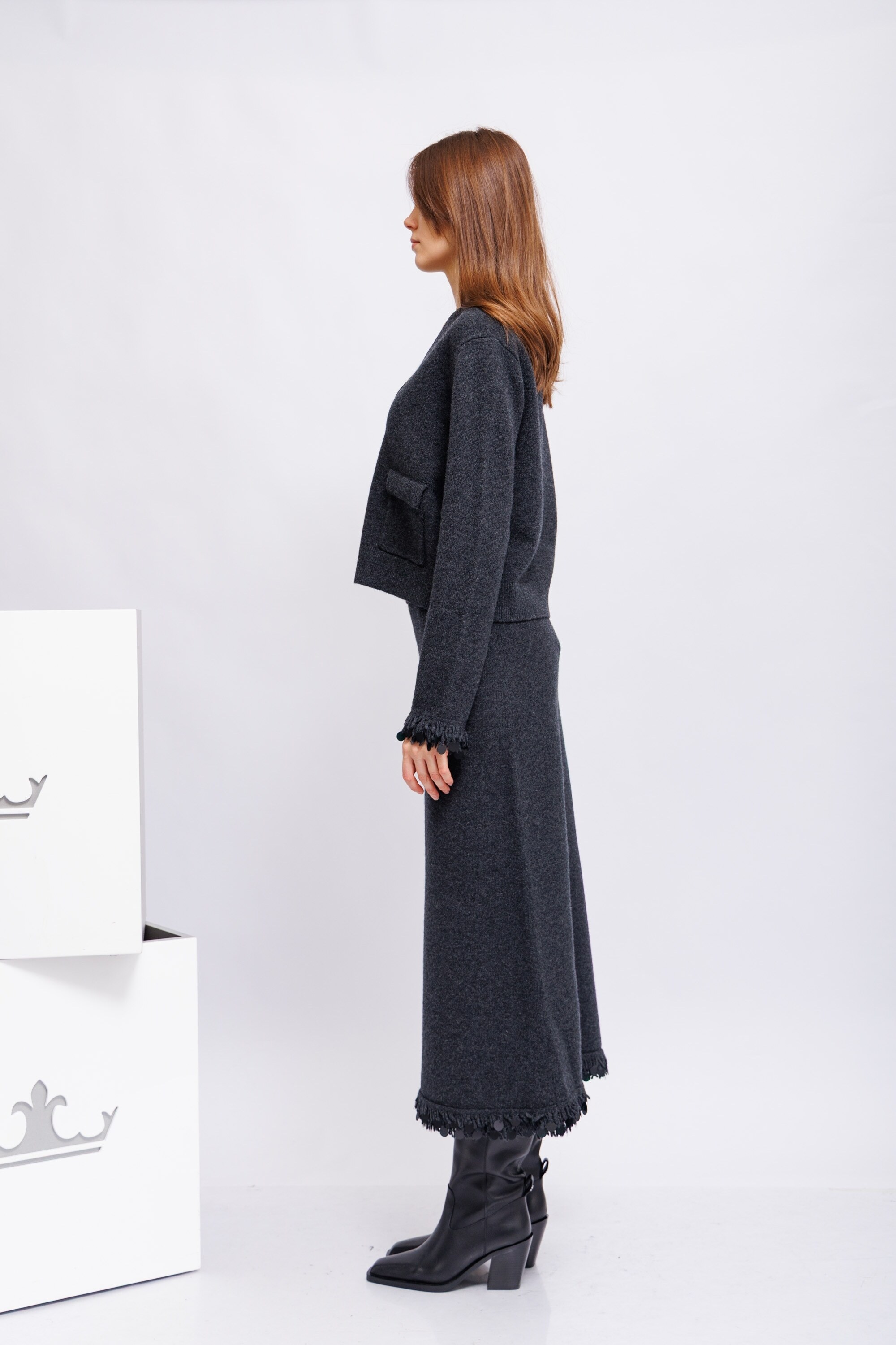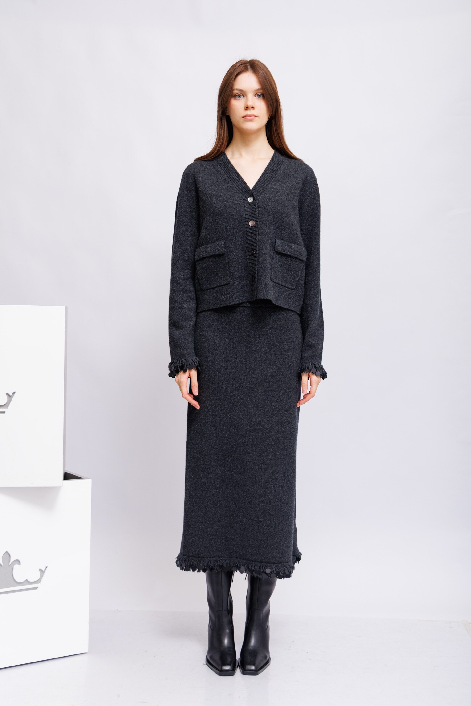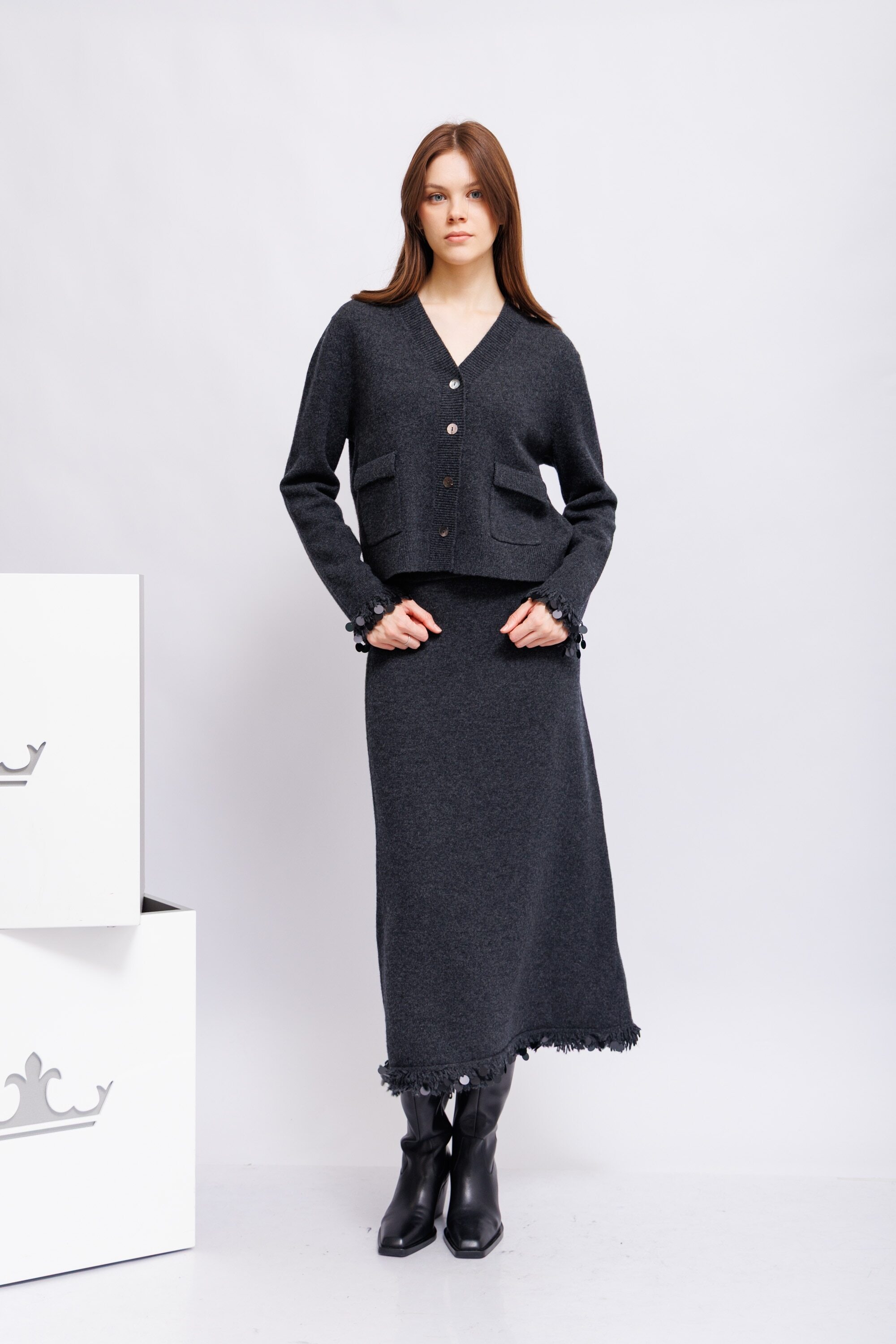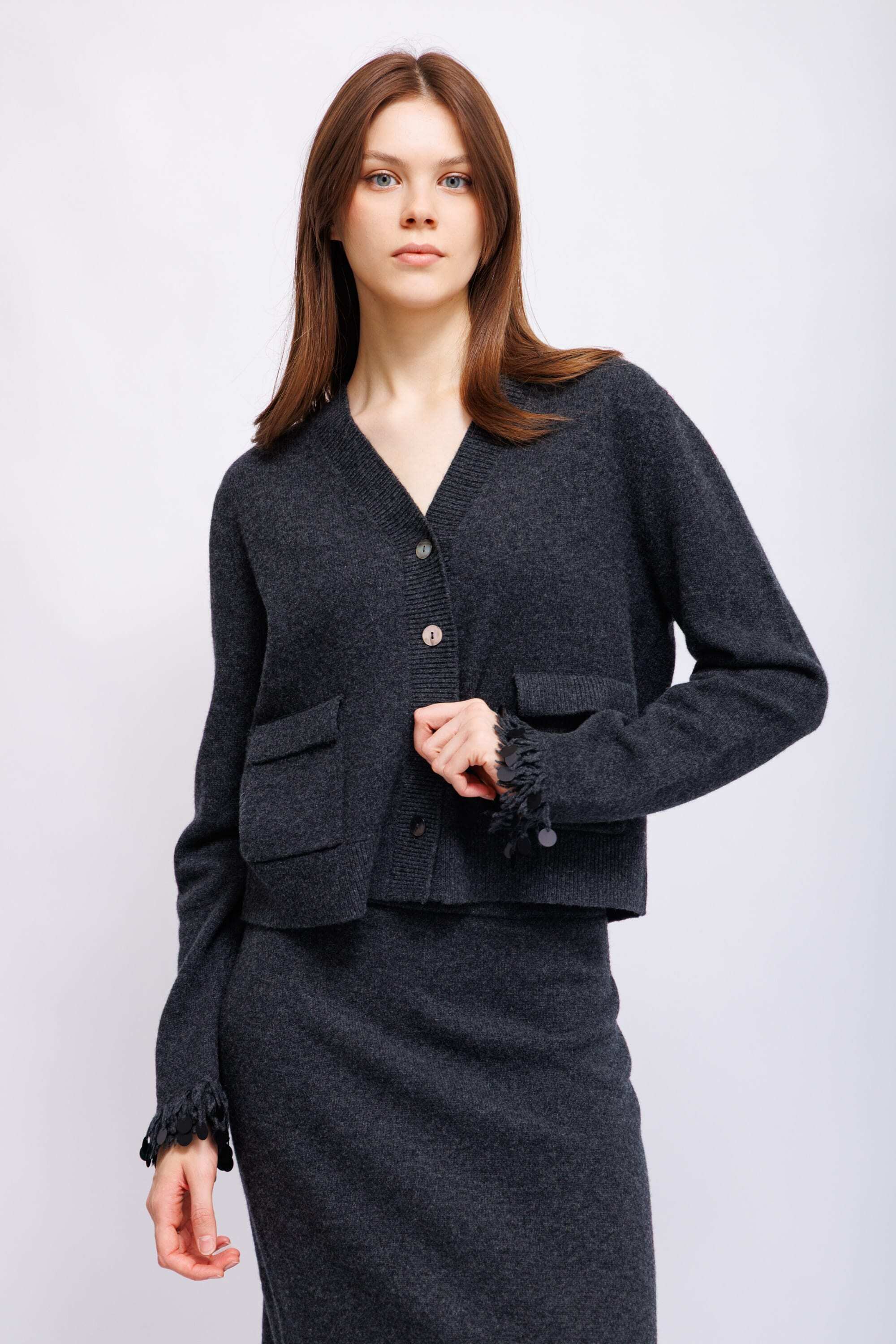 Мягкий и удобный, с накладными карманами и пайетками в тон на манжетах и подоле, создающими лёгкий блеск. Идеально подходит для создания изысканных, но практичных образов.