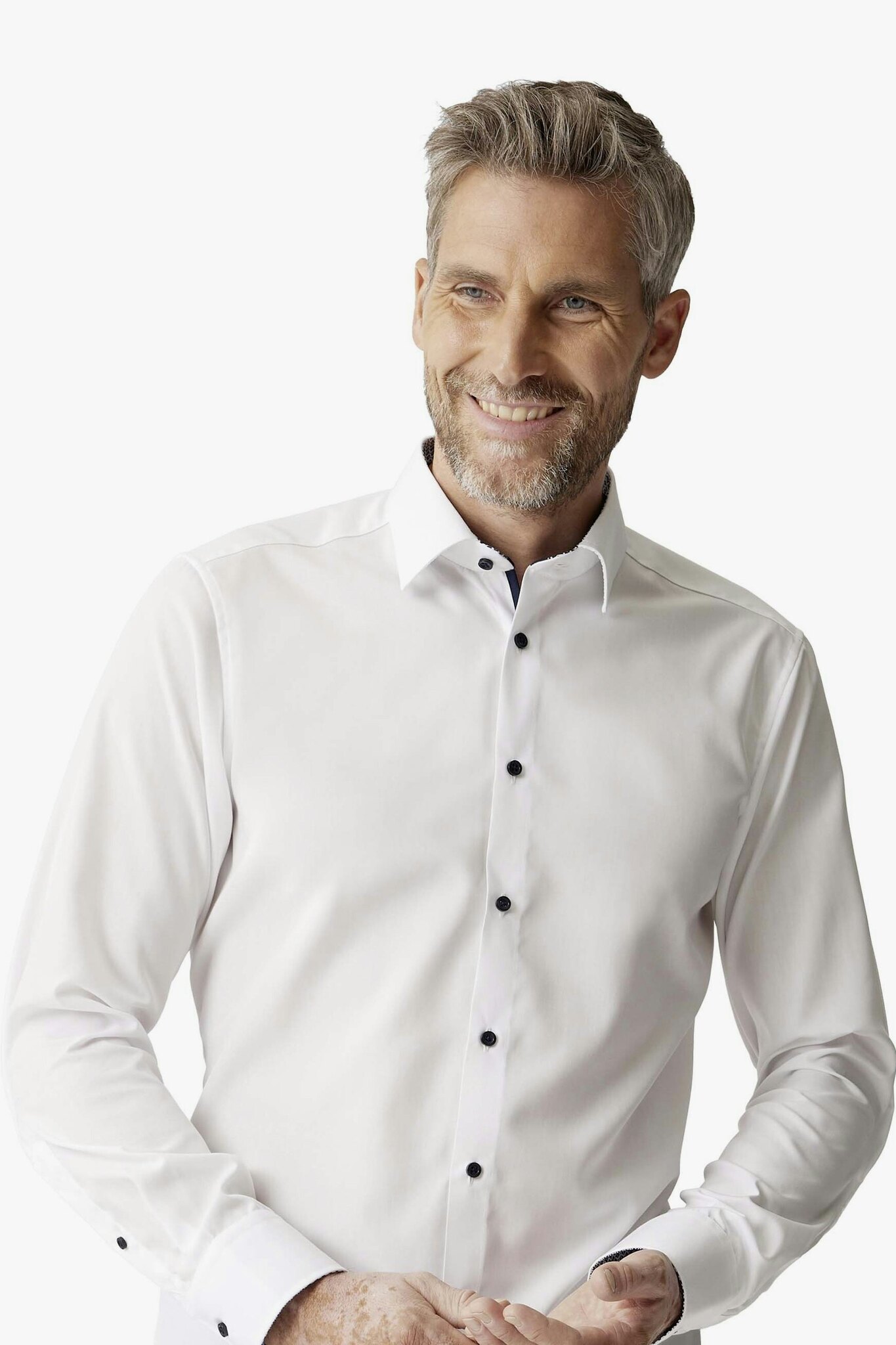 Сорочка белаяСлегка приталенная эластичнаяРукава длинныеВорот-"Кент" классическийПуговицы темные