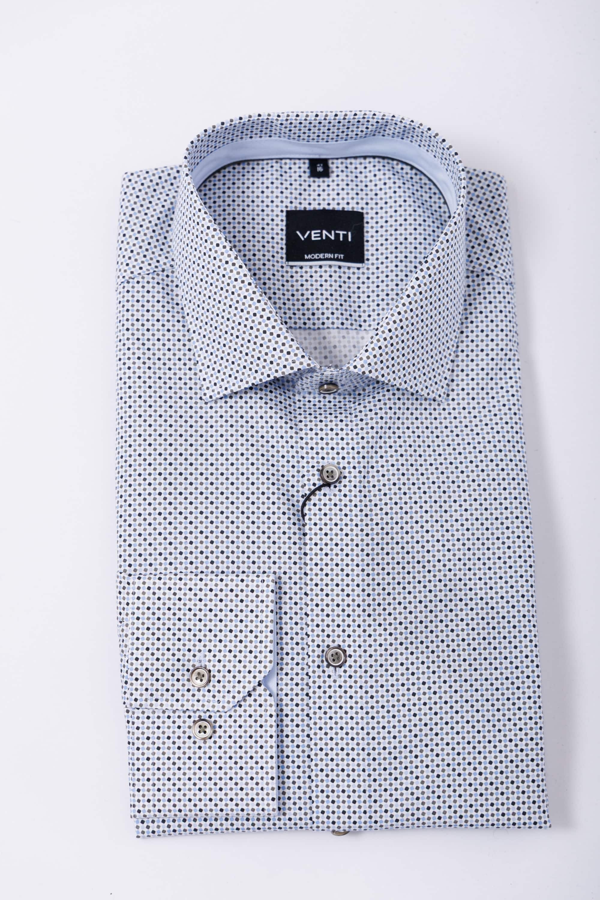 Сорочка голубая в серый узор точкамиСлегка приталеннаяРукава длинныеВорот-"акула" (раскрытый по форме)Пуговицы серые