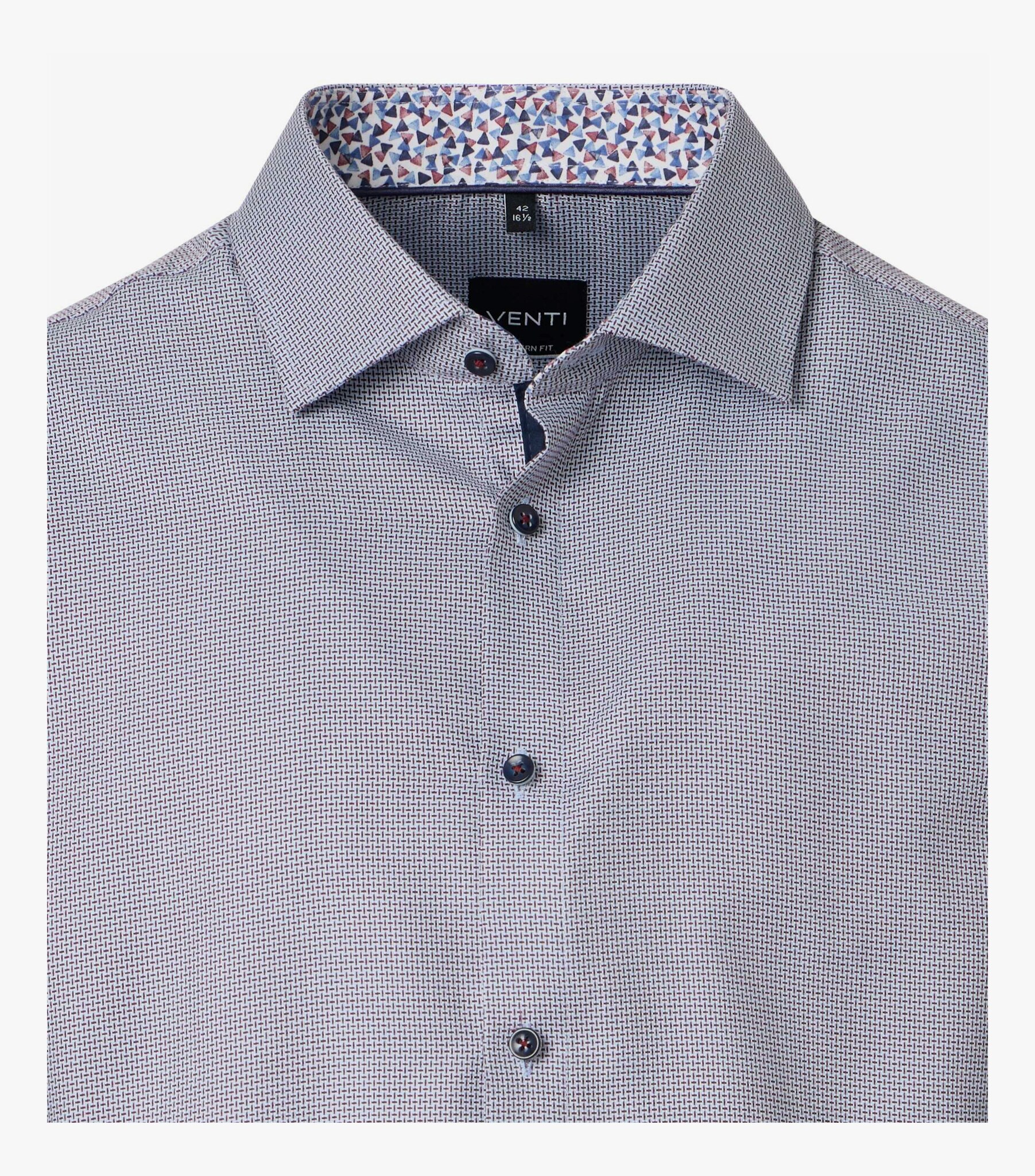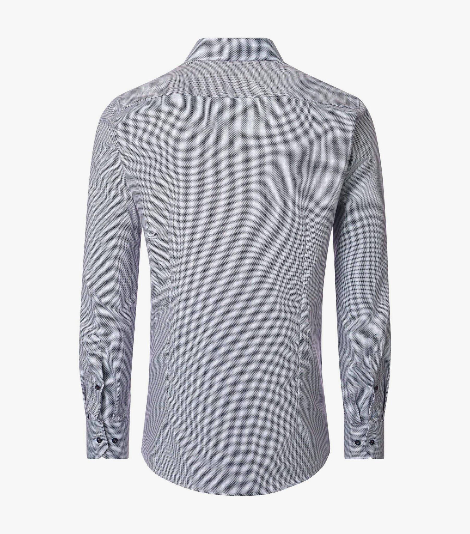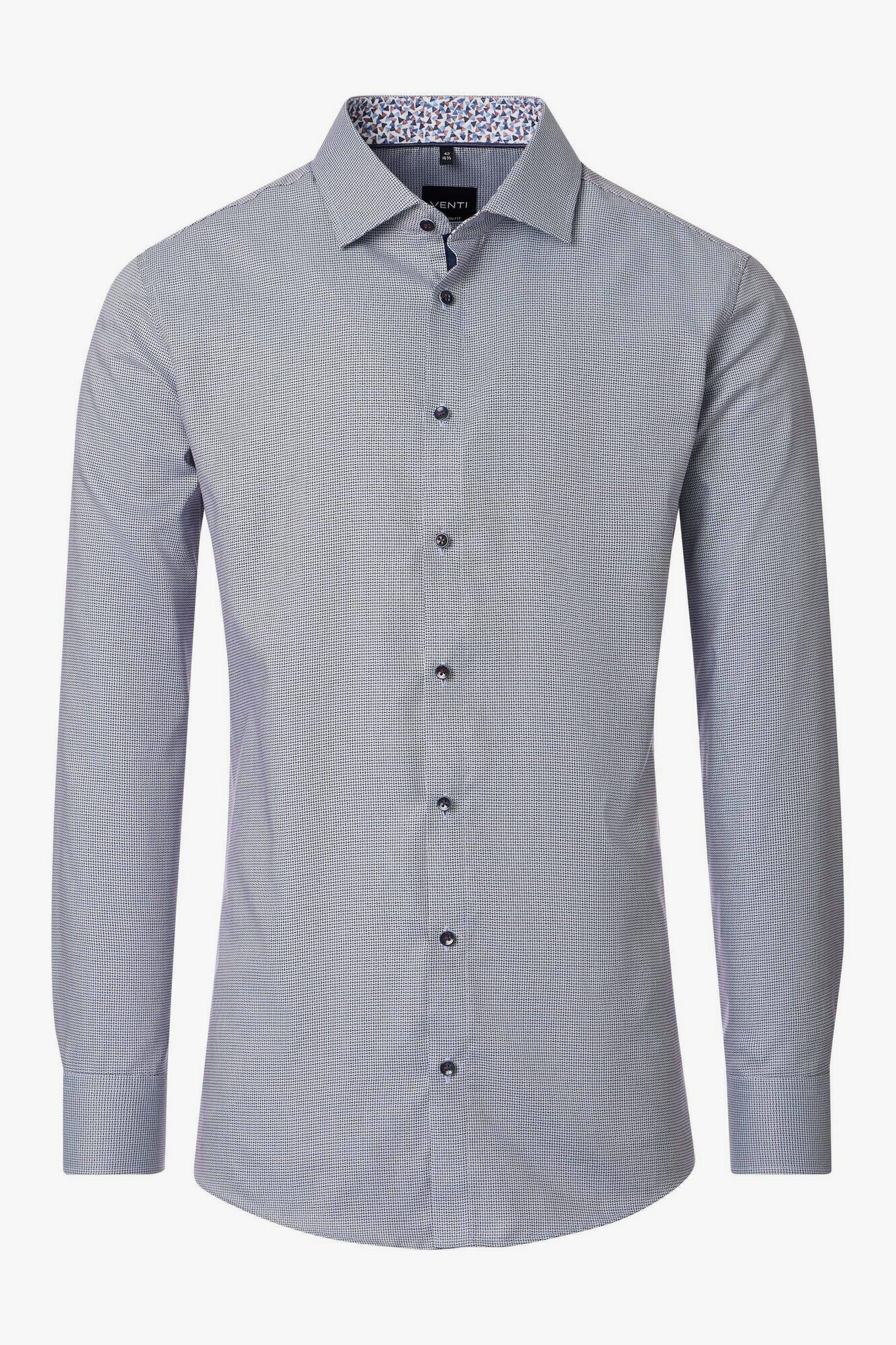 Сорочка голубая в мелкий узорСлегка приталенная эластичнаяРукава длинныеВорот- "кент" классическийПуговицы тёмные на контрастных нитяхВнутри -контрастная отделка